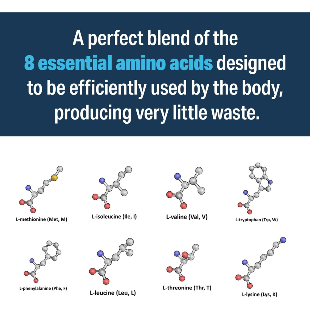 Our supplement includes the following amino acids: L-Isoleucine, L-Leucine, L-Lysine, HCI, L-Methionine, L-Phenylalanine, L-Threonine, L-Tryptophan and L-Valine.