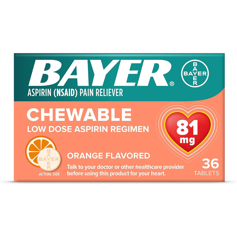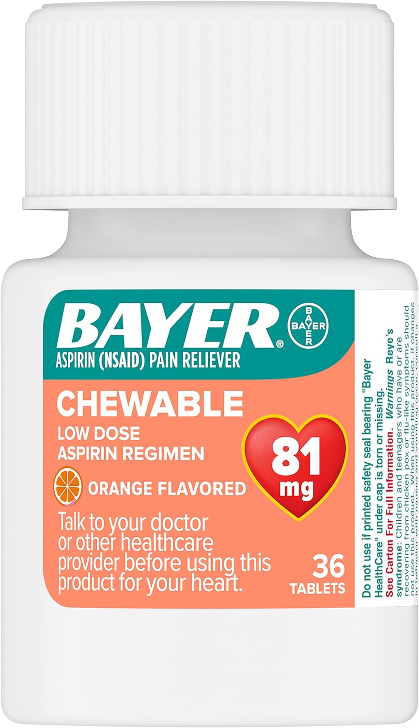 Bayer Chewable orange flavored aspirin (NSAID) low dose baby aspirin 81 mg 216 tablets per box Perfect for aspirin regimen. Delicious orange flavor. 81 mg per tablet.