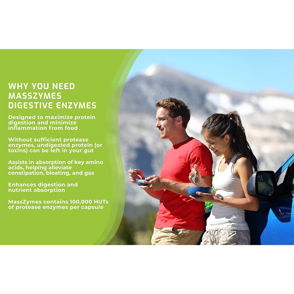 MassZymes is designed to maximize protein digestion and minimize inflammation from food. It also assists in absorption of key amino acids, helping alleviate constipation, bloating, and gas.