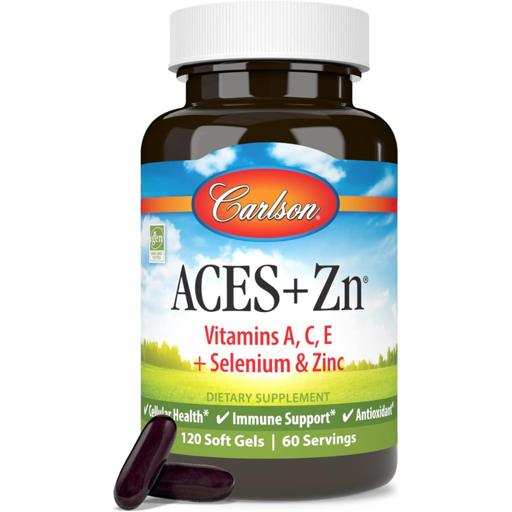 Aces Zn antioxidants 120 soft gel product Description provides the nutrients in the original ACES formula, plus the mineral Z zinc is necessary for the proper functioning of the immune system. It is an important component of another of the body’s antioxidant enzymes superoxide dismutase. Suggested Use As a dietary supplement take two soft gels daily at mealtime – or as directed by your healthcare professional. Supplement Facts Serving Size: 2 soft gel amount Per Serving% Daily value***vitamin a (as beta carotene)15total fat1g1%total carbohydrateprotein1%vitamin a (as beta carotene, 000 mcgrae333%vitamin C (as calcium ascorbate mg556%vitamin E (as d-alpha tocopherol IU1, selenium (as l-selenomethionine)100 mcg182%calcium (as calcium ascorbate mg4%zinc (as zinc citrate mg136% percent daily Values are based on a 2, 000 calorie diet Other Ingredients: sunflower oil, soft gel shell (beef gelatin, glycerin, water, carob), Soybean Oil, Palm fruit Stearin, beeswax, soy lecithin, Glyceryl Monostearate. Soft gel-color variations may occur calories does not contain: salt-free. Sugar-free. Preservative-free. Wheat-free. Corn-free. Milk-free. Starch-free. Yeast-free. Gluten-free. Warnings: Keep out of reach of children. As with all dietary supplements, consult your healthcare professional before use. See product label for more information.
