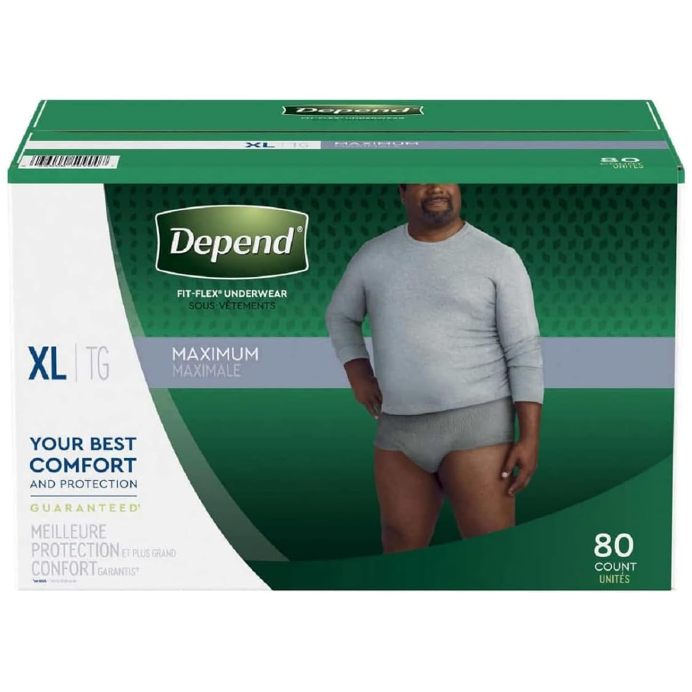 Reclaim and reconnect with what matters most in your life in the new and improved Depend fit-flex incontinence Underwear for men. Now in more sizes for better comfort, Depend disposable Underwear features confidence core technology, depends fastest absorbing material, to instantly absorb wetness for dry, comfortable protection. Drawing wetness away from the skin, the thin, contoured pad locks in urine and odors. Snug, brief-like leg openings have all-around elastics for a close-to-body fit. Just step in and pull on. With the improved waistband for added security, Depend fit-flex for men provide an underwear-like fit. Depend incontinence Underwear are soft, quiet, breathable and discreet, and the natural fit is more flexible* so it moves with you. Depend incontinence Underwear for men are latex-free, lotion-free, fragrance-free and come in a neutral Gray color. Depend for men are eligible for purchase with a flexible spending account (fsa). size extra large fits men with a 44-64-inch waist and who weigh 200-300 lbs. Product features: sized for better comfort improved waistband for added security and an underwear-like fit cloth-like material provides comfort that feels like real Underwear confidence core technology provides dry, comfortable protection where men need it most form-fitting Lycra strands offer a smooth, comfortable fit that is more flexible maximum absorbency, disposable Underwear trap and lock in odor comes in a neutral Gray color ships discreetly in a plain corrugated box fsa-eligible in the U.S. Only includes 80 pairs *vs. Leading bargain brand (model 48461).