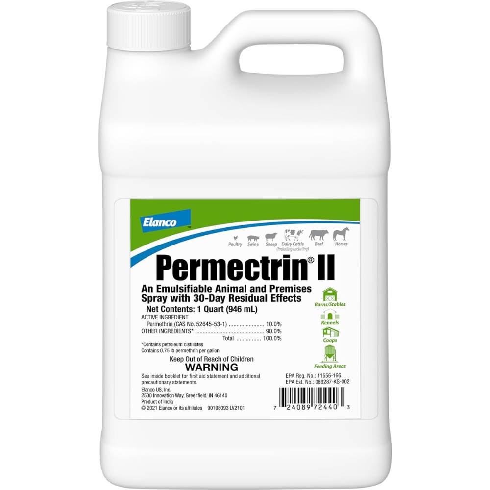 Permectrin II insecticide kills flies, lice, mites, ticks (including ticks that carry Lyme disease), fleas, spiders, mosquitoes and cockroaches on horses, beef and dairy cattle, swine, sheep, poultry, dogs and their premises. May be applied as a spray, dip or on a back-rubber. Mixes with water or mineral oil and offers a 30 day residual effect.