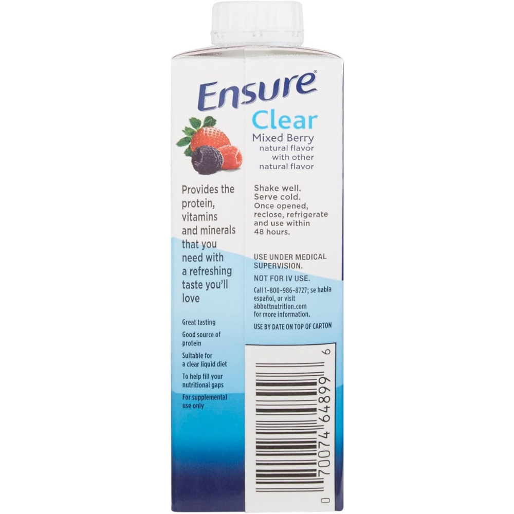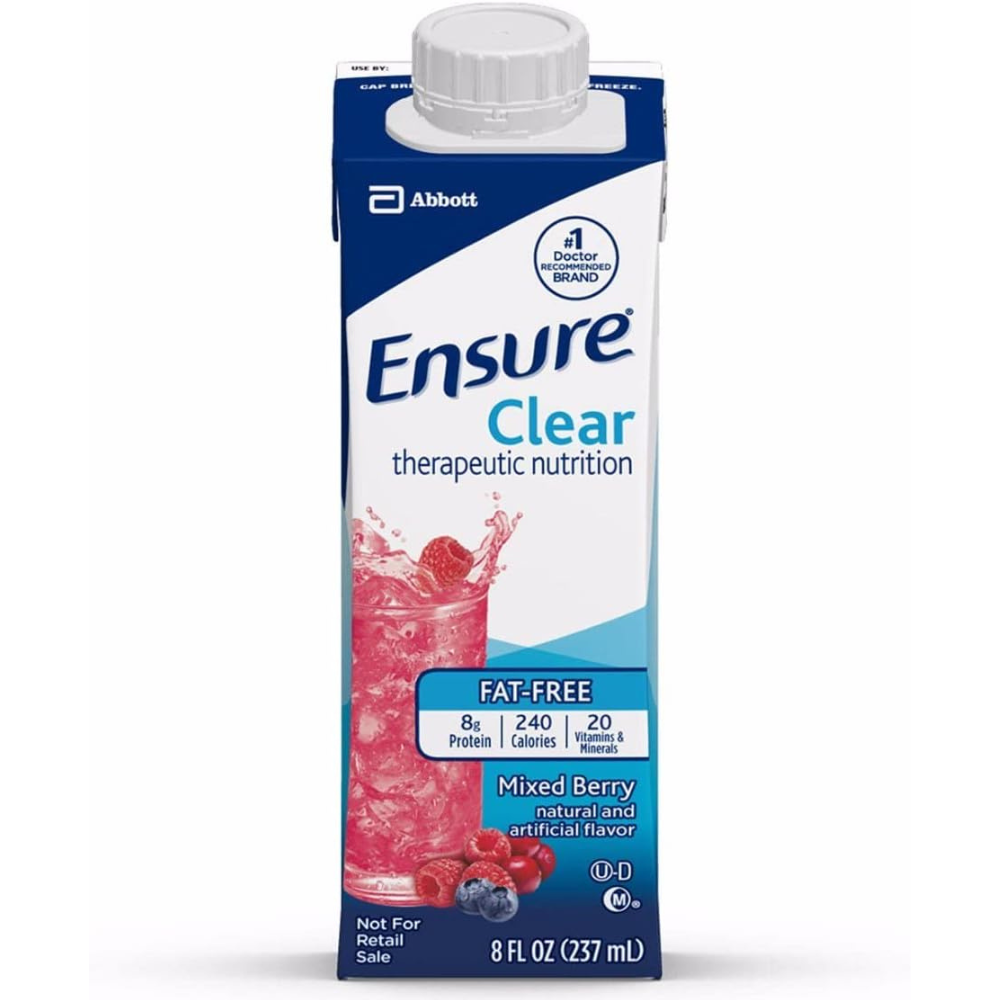 ENSURE CLEAR. NEW 8OZ RE-CLOSEABLE BOTTLE Ensure Clear is a great-tasting, clear liquid nutrition drink that contains high-quality protein and essential nutrients. Ensure Clear is fat-free, making it an ideal choice for patients on clear-liquid, pre- and post-surgical, bowel prep, fat-malabsorptive, and fat-restricted diets. It is also ideal for patients who prefer a fruit-flavored alternative to creamy shake-like supplements. Can benefit patients who have malnutrition, are at nutritional risk, or are experiencing involuntary weight loss. For oral use. Good source of high quality protein (7 g/serving). Clear liquid nutrition. Good source of 19 essential vitamins and minerals. Refreshing fruit flavors provide taste alternative. Contains no fruit juice. Kosher. Halal. Gluten-free. Low-residue. Suitable for lactose intolerance. PRECAUTIONS: Not for sole-source nutrition. Not for parenteral use. Not for people with galactosemia.