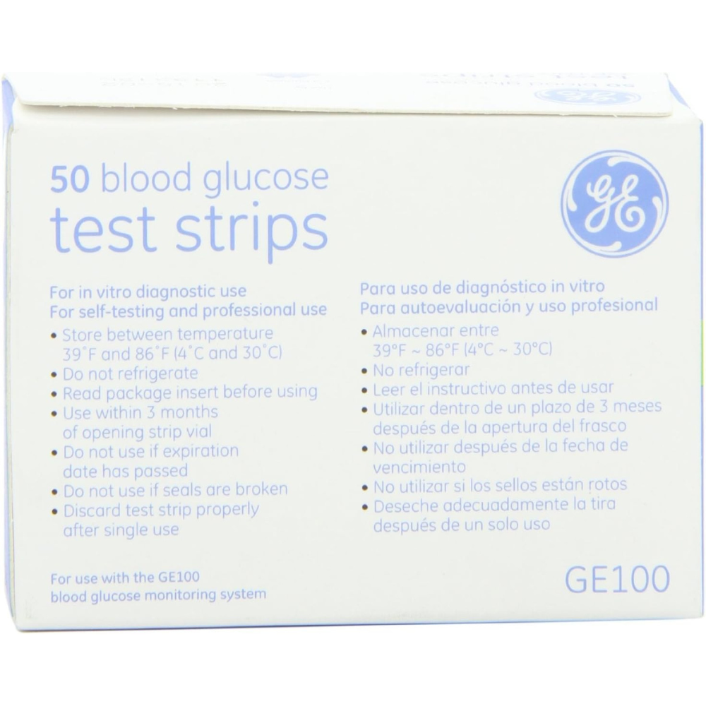 GE100 Blood Glucose Test Strips The GE100 Test Strips are designed with the needs of diabetics in mind. Using an innovative strip design, patented noble metal technology and True Auto Coding allows the GE100 Test Strips to deliver consistent, reliable, and accurate results.