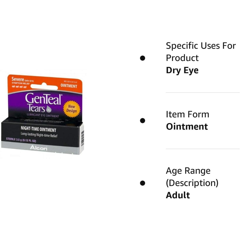 To soothe your dry or irritated eyes at night, add GenTeal PM Lubricant Eye Ointment Severe Dry Eye Relief to your bedtime routine. This concentrated ointment will give you the comfort your eyes need, and will help you get the rest you deserve. It is preservative and lanolin free. Just a small amount placed inside the corner of your lower eyelid gives you long-lasting relief and protection from minor irritation.