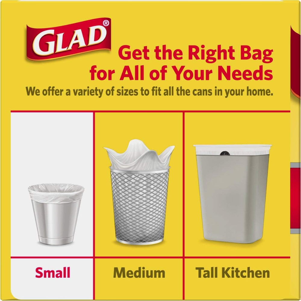 Glad Small Trash Bags are convenient and the perfect size for everyday use. These trash bags are strong and sturdy to avoid messy trash disasters as you transport it. They are small and portable making them excellent car garbage bags. Use them to pack wet or dirty clothes, sports equipment, toys and more while you are on the go. These 4 gallon size trash bags fit just about every small bin or baskets in the house and are great for use in home offices, bathrooms, bedrooms and seasonal cleaning around Spring or Back to School.