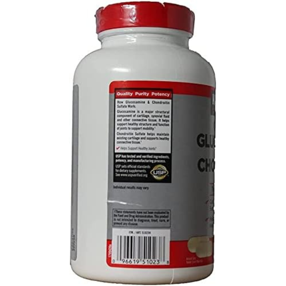 Safety Information If you are pregnant, nursing or taking any medications, consult your doctor before use. Discontinue use and consult your doctor if any adverse reactions occur.Keep out of reach of children. Ingredients Ingredients: Glucosamine Hydrochloride, Chondroitin Sulfate Sodium (Bovine), Croscarmellose Sodium, Microcrystalline Cellulose, Silicon Dioxide, Stearic Acid, Magnesium Stearate, Hydroxypropyl Methylcellulose, Sodium Lauryl Sulfate, Artificial Vanilla Flavor, Pol hylene Glycol, Carnauba Wax. May contain medium chain triglycerides, triacetin. Directions Take two tablets daily with a full glass of water. Legal Disclaimer Statements regarding dietary supplements have not been evaluated by the FDA and are not intended to diagnose, treat, cure, or prevent any disease or health condition.