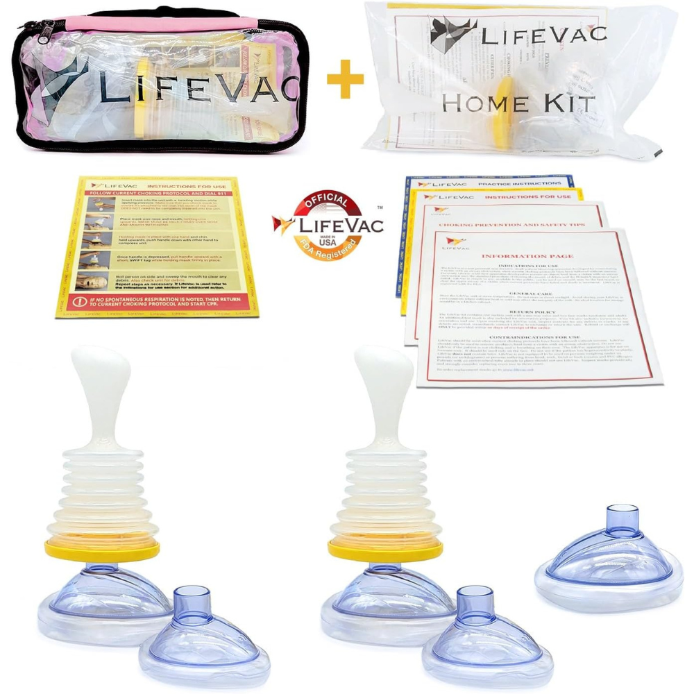 Combo Kits Covers Children and Adults: Keep one at home and take the travel kit with you on the road. Home Kit includes One LifeVac suction device with Patented One-way Valve, One Pediatric Mask, One Adult Mask, Once Practice Mask, and One Set of Instructions for using the LifeVac. Travel Kit includes One LifeVac suction device with Patented One-way Valve, One Pediatric Mask, One Adult Mask, and One Set of Instructions for using the LifeVac, included in a Durable Travel Bag