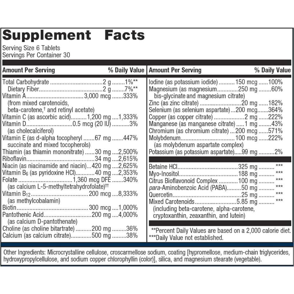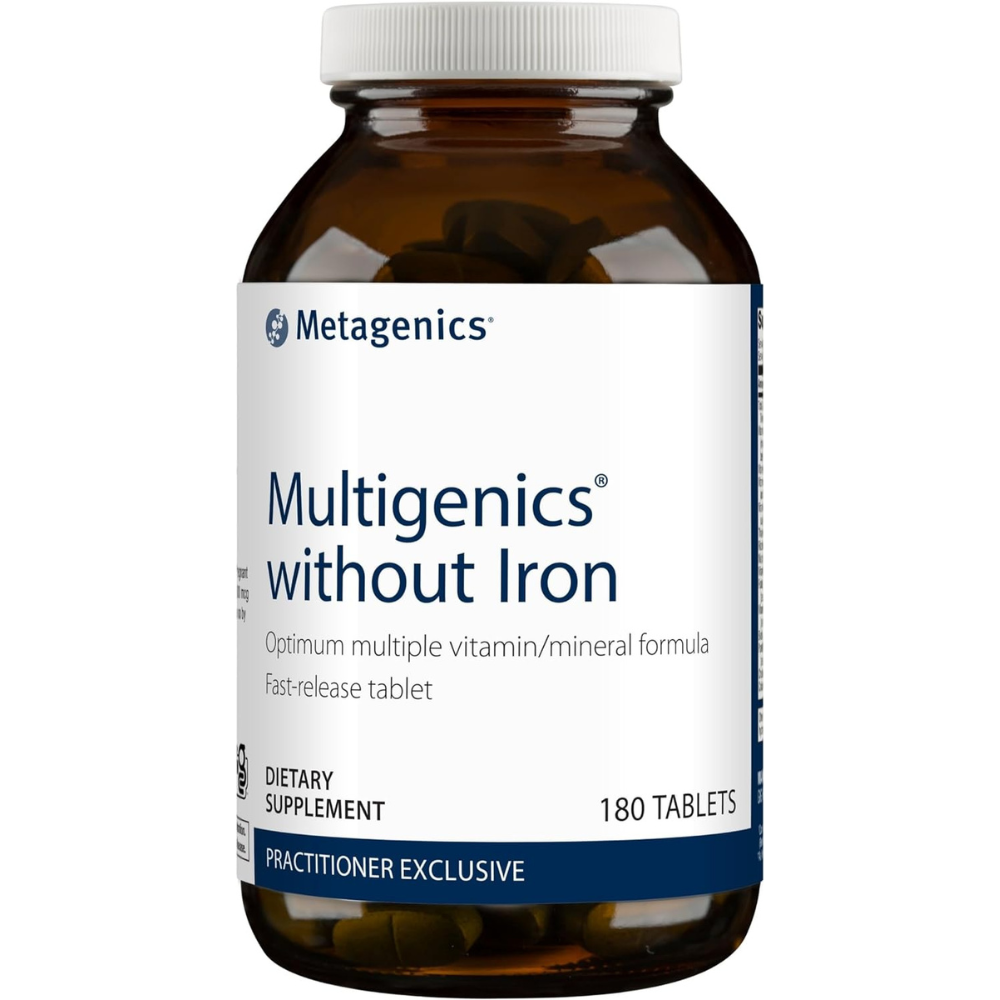 Metagenics’ Multigenics without Iron is a meticulously crafted multivitamin and mineral formula. This multivitamin is a unique vitamin and mineral formula designed for optimal tablet disintegration and digestibility. This formula features high levels of ratio-balanced B vitamins with extra B12 to support homocysteine metabolism.* It also includes Caro-xan, our proprietary blend of beta-carotene and Betatene mixed carotenoids. Plus, these tablets include a 2-to-1 ratio of calcium to magnesium for bone support.* These components deliver a well-rounded spectrum of vitamins to support your body’s nutritional needs.*