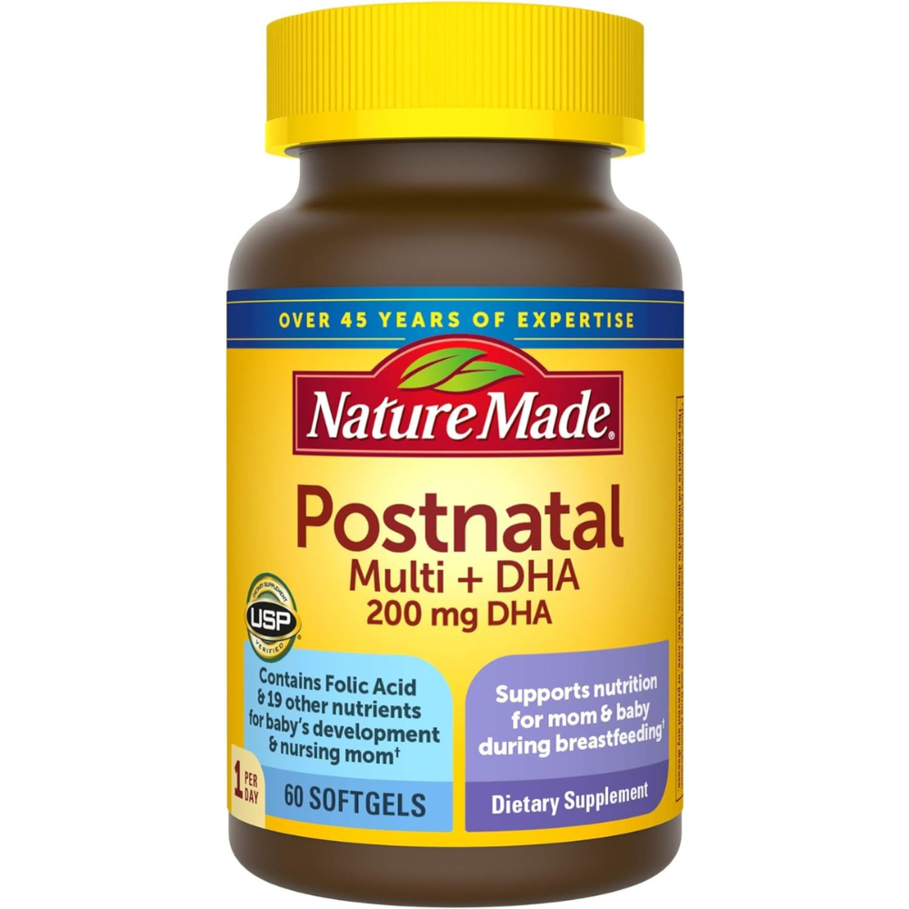 Nature Made Postnatal Multivitamin + DHA is designed to support the increased nutritional needs of nursing moms while continuing to support baby’s development while breastfeeding. Energy requirements are higher during lactation and the body needs certain nutrients in adequate amounts to meet those increased energy demands. This postnatal multivitamin offers higher amounts of Vitamins A, C, D3, and E, compared to our Prenatal Multi + DHA, to support mom’s nutritional needs while breastfeeding. Each serving (1 softgel) contains postnatal Vitamins A, C, D3, E, plus all 8 B vitamins – and also includes DHA, Calcium, Iron, Iodine, Magnesium, and Zinc. DHA is an important Omega-3 fatty acid that helps support fetal brain and eye development. Calcium and Vitamin D work together to build and support strong bones for both baby and mom. Iron is vital for red blood cell formation and to deliver oxygen to cells throughout the body. Nurse healthy habits while nursing, with Nature Made Postnatal Multivitamin + DHA.