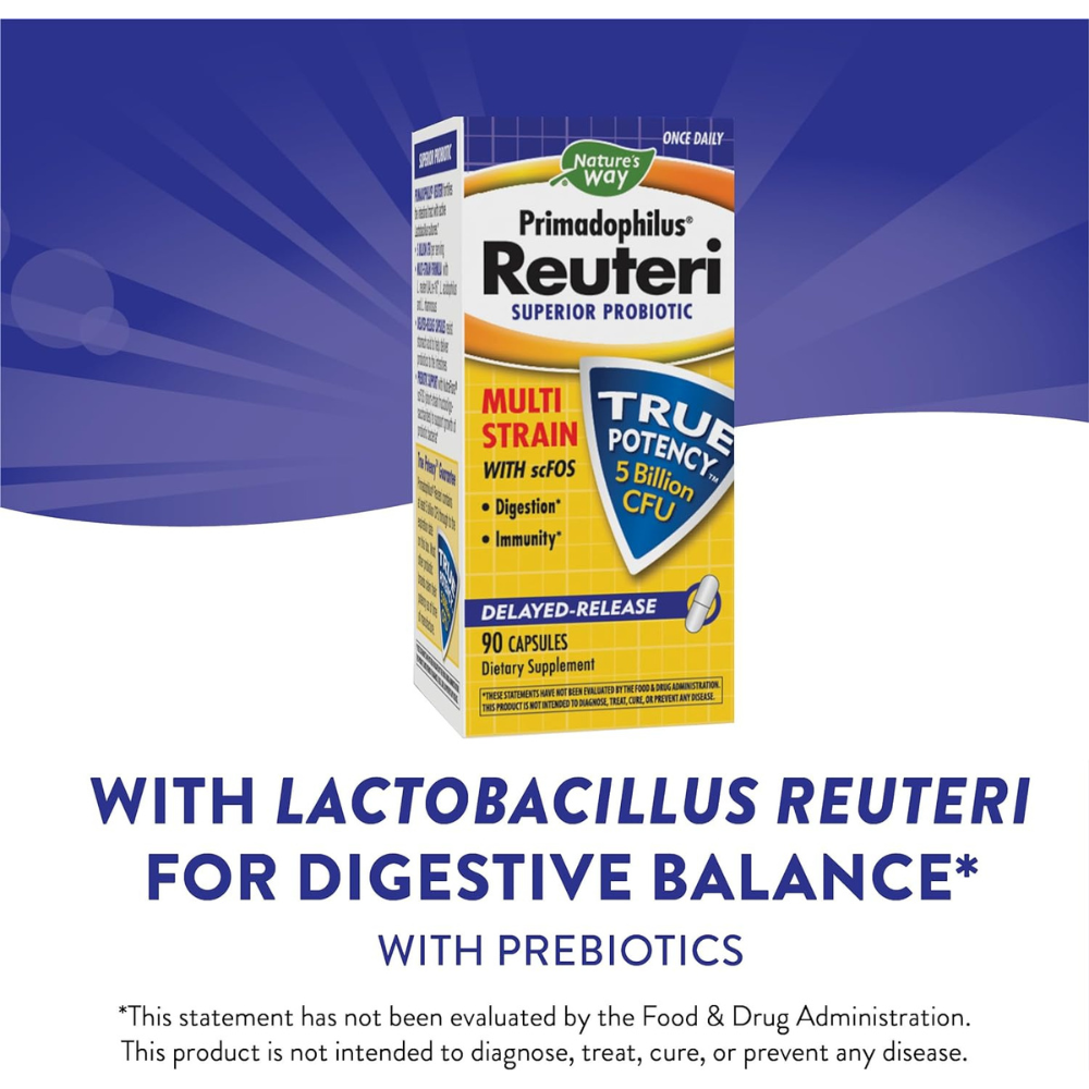 Primadophilus Reuteri Probiotics by Nature’s Way is formulated to help you find your way to wellness. It is a probiotic that features a multi-strain probiotic formula with a potency of 5 billion CFU per serving. With Lactobacillus reuteri UALre-16TM, L. acidophilus DDS(R)-1, and L. rhamnosus UALr-18TM, these probiotics are designed to support immune and digestive health.* DDS(R) is a registered trademark of UAS Laboratories LLC and used under license. Primadophilus Reuteri also contains plant-based prebiotic NutraFlora(R) scFOS, food for good baceteria.* NutraFlora(R) is a registered trademark of Ingredion.