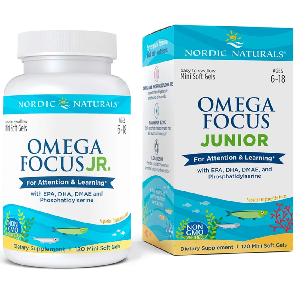 WHY OMEGA-3S – Omega Focus Jr. is a unique blend of concentrated omega-3s EPA & DHA from fish oil, plus key nutrients DMAE and phosphatidylserine that work together to benefit attention and learning by supporting overall brain health.