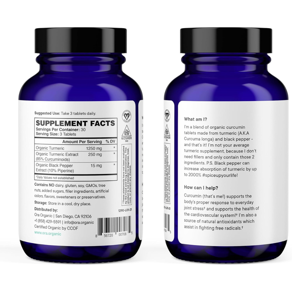 Ora Organic Turmeric Curcumin with Piperine – Pure Extracts for Joint Stress and Cardiovascular Health, Support Healthy Cognitive Function, No Filler Ingredients – 90 Vegan Tablets, 1 Month Supply