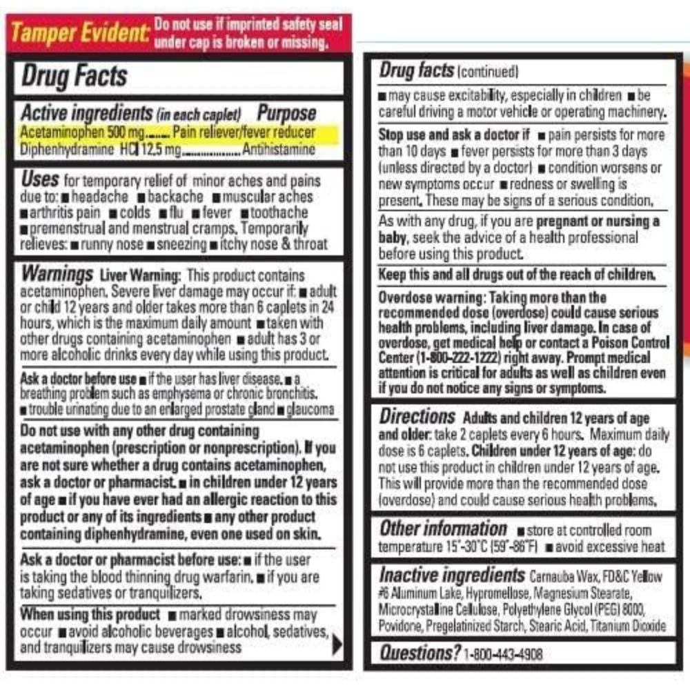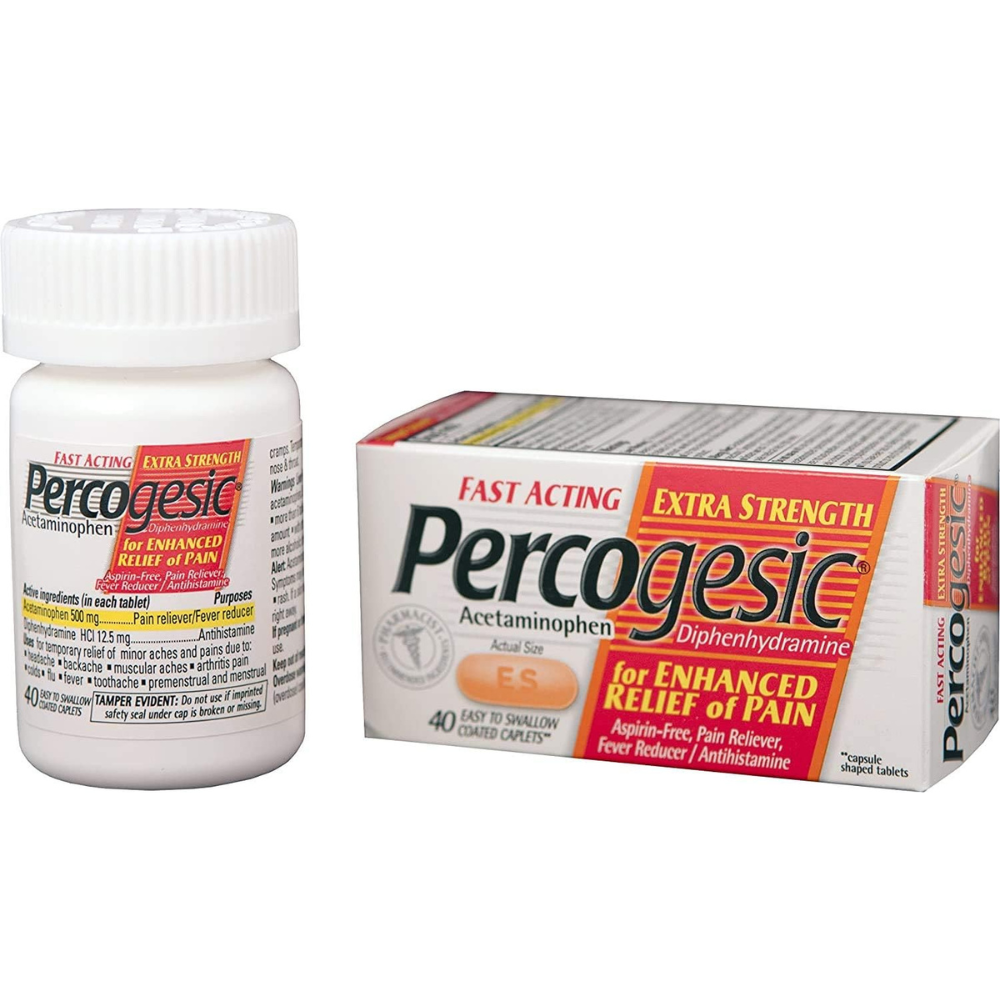 Percogesic Extra Strength Pain Reliever Tablets, for enhanced relief of pain. The easy-to-swallow coated caplets give you enhanced relief from aches and pain associated with colds, flu, fever, arthritis and more. It also relieves runny noses and sneezing. Dual Action Relief. Pharmacist recommended ingredients, Acetaminophen and Diphenhydramine HCl, provide aspirin-free relief that you can trust without worrying about a prescription. Don’t let pain get in your way! When aches and pain come your way, you can rely on Percogesic Extra Strength to give you the fast, effective relief you need to get out and get on with your day.