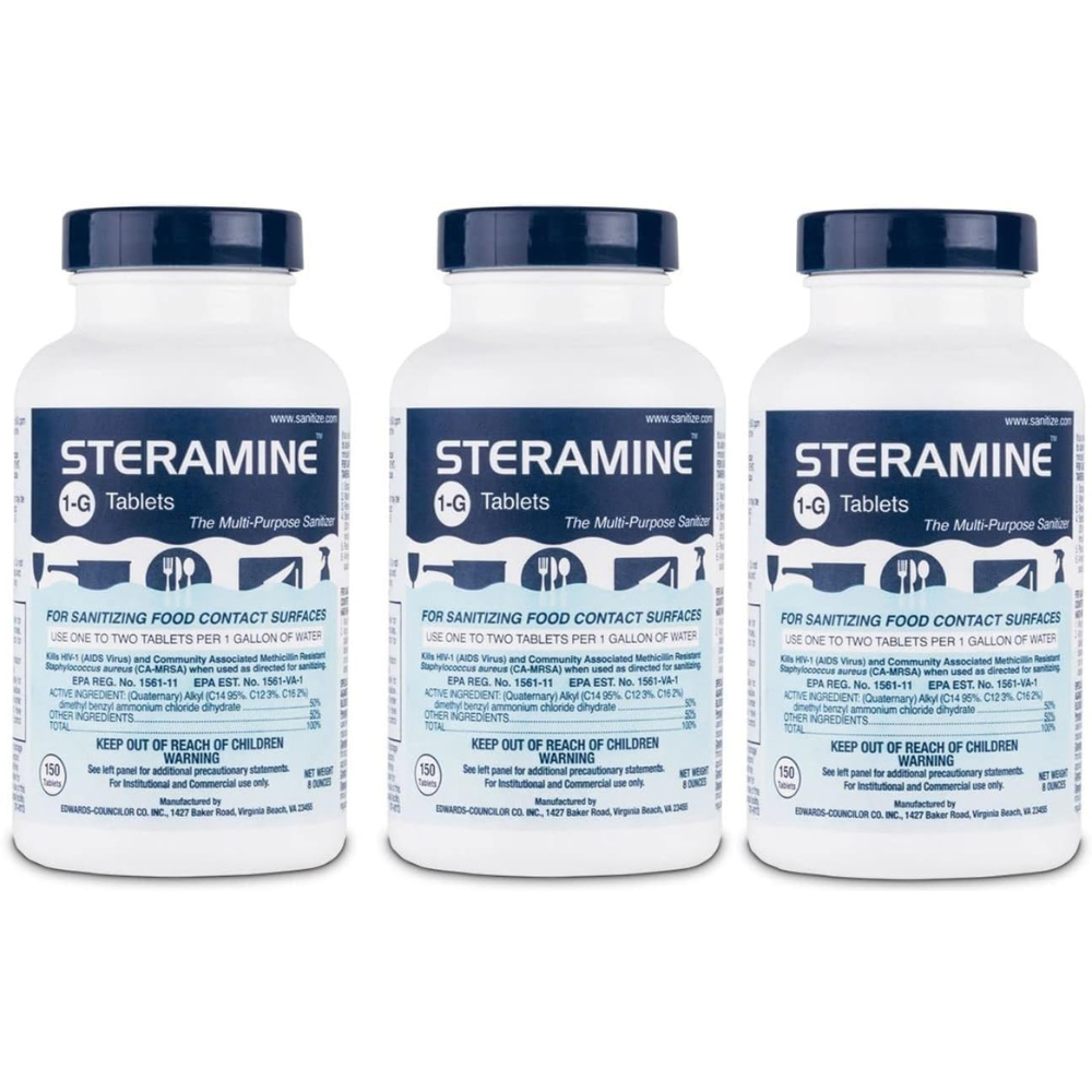 CONCENTRATED SANITIZER TABLETS – Steramine 1-G Quaternary Tablets Multi-Purpose Sanitizer, 150 tablets per bottle, Pack of 3 Bottles