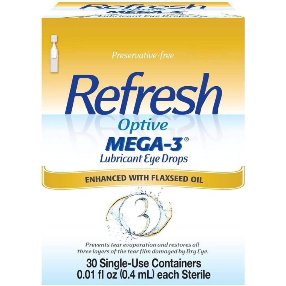 Our most advanced formula – REFRESH OPTIVE Mega-3. Preservative-free, low blur formula fortifies and restores the lipid layer. Its unique blend of natural oils helps prevent tear evaporation. Treats Dry Eye signs and symptoms associated with Meibomian Gland Dysfunction (MGD). Nourishes all three layers of the tear film damaged by Dry Eye for immediate, long-lasting relief. This lipid-enhanced lubricant eye drop is clinically proven to treat the signs and symptoms of Dry Eye. Mega-3 does not require shaking prior to use, unlike Retaine MGD. REFRESH OPTIVE Mega-3 Preservative-Free Lubricant Eye Drops come in sterile, single-use vials you can take with you anywhere and are safe to use as often as needed.