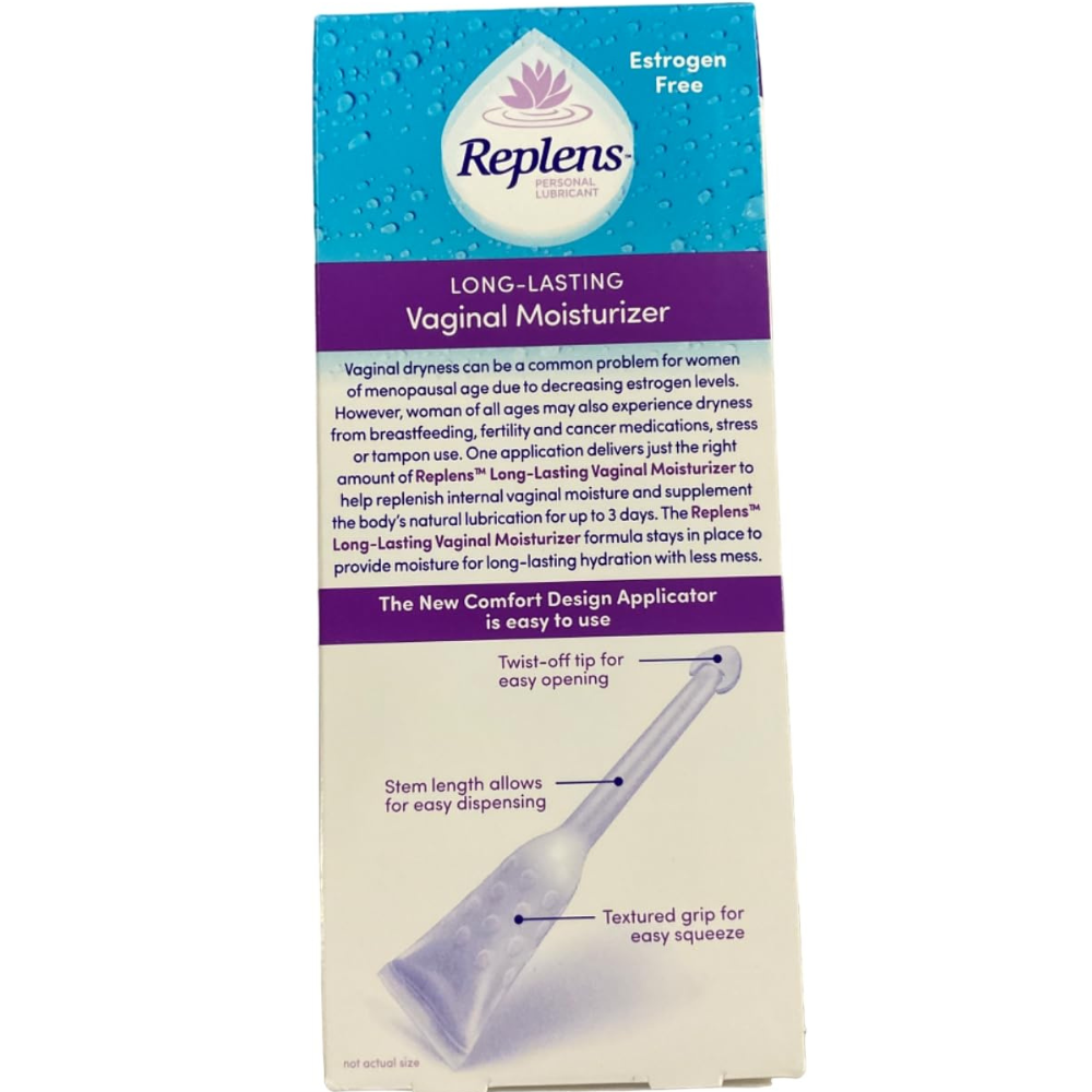 Replens Moisturizer Estrogen Free Long-Lasting Vaginal Moisturizer Replens Silky Smooth Personal Lubricant Free Sample Inside! Helps Replenish Vaginal Moisture Supplements the Body’s Natural Lubrication Last up to 3 Days 8 Pre-filled Disposable Applicators 0.24 OZ (6.7 g) Each From the Makers of 1 First Response Vaginal dryness can be a serious problem for women of menopausal age and beyond, new mothers, cancer/chemotherapy patients and women with dryness due to medications, stress or tampon use. Replens moisturizer helps replenish vaginal moisture and provides long-lasting results. Replens moisutizer is compatible with natural rubber latex, polyisoprene, and polyurethane condoms. Fragrance Free Estrogen Free Each pre-filled, disposable applicator delivers just the right amount of Replens Long-Lasting Vaginal Moisturizer to provide moisture at the source of discomfort. The Replens formula stays in place to deliver moisture for long-lasting hydration.