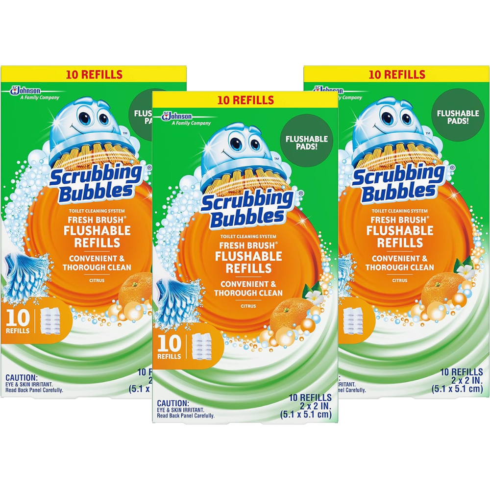 Scrubbing Bubbles Toilet Cleaning System Fresh Brush Flushable Toilet and Toilet Bowl Cleaner Refill Pads, Citrus Action Scent, 10 CT Refills Per Pack: Convenient and thorough clean. Scrubbing Bubbles Fresh Brush is the only system with both heavy duty pads and flushable pads 4-in-1 Cleaning Power: Eliminates odors, removes limescale and cleans under the rim as well as below the water. When you’ve got the right product for the situation at hand, even the most overwhelming tasks become… well, a lot less overwhelming. Cleaning becomes simple, rewarding — and more manageable. Suddenly everything’s under control. Our Fresh Brush Flushables help remove stains, provide a great Citrus Action scent and can quickly be flushed away after use. But, the best part is that there’s no germy brush to store. Each pack of this Scrubbing Bubbles Toilet Cleaning System Fresh Brush Toilet and Toilet Bowl Cleaner Flushable Refills contains 10 citrus action scent refill pads. USES: This product works great on toilets and toilet bowls.