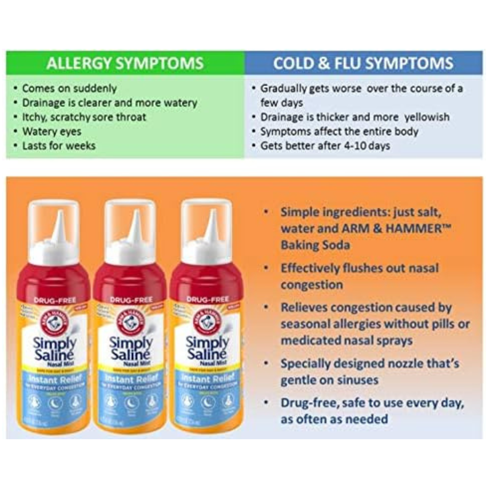 Simply saline Nasal Spray helps deliver instant congestion relief by flushing out irritants. It’s Adaptable nozzle and gentle mist make it easy to use. Plus, simply saline is always safe to pair with your cold or allergy medicine because it’s drug free, preservative free, steroid free, and non-addictive. In fact, it’s made from three simple ingredients: Water, salt, and arm & Hammer baking soda