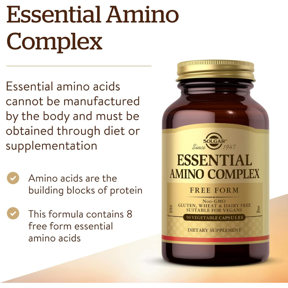 Gluten, Wheat & Dairy Free; Solgar Essential Amino Complex is non-GMO, vegan, kosher, and free of: gluten, wheat, dairy, soy, yeast, sugar, sodium, artificial flavor, sweetener, preservatives and color; Suitable for vegetarians