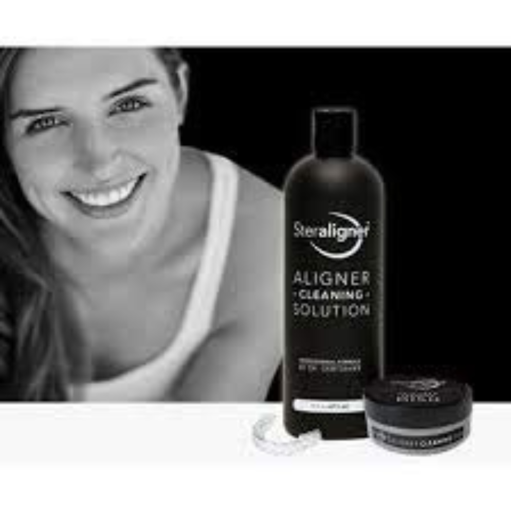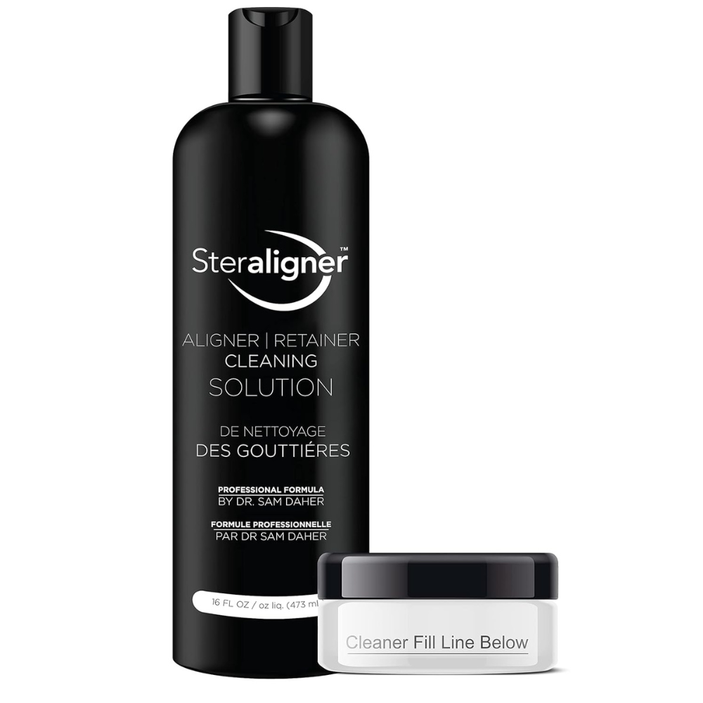 Introducing the Aligner Tray Solution, brought to you by Steraligner, the cleaning and solution trusted and created by Dr. Sam Daher, DDS, M.SC. FRCD(C) With no need to dissolve crystals or tablets, and with a speedy 3 minute cleaning time, the Steraligner deep cleans your aligner tray, preventing the buildup of plaque, tartar, stains and bad breath. Speedy Deep Clean When you clean with Steraligner, you can be sure of a powerful, thorough cleansing of your Aligner Tray in a matter of minutes. The super strength cleaning formula ensures a faster cleanse than most other brands on the market. Improved Oral Hygiene With your purchase, you will receive a 16 oz bottle that helps remove bad, and improves the health of your teeth and gums, reducing yellowing and bad breath. Simply pour the Steraligner solution into the soaking dish, and in 3 minutes it’s ready! Powerful Ingredients Tested by a recognized independent laboratory, the cleaning solution comprises of Water, Surfactant, Sodium Bicarbonate, Natural Essential Oil extracts, Sodium Benzoate, Sodium Gluconate, Disodium EDTA. Multipurpose Use Not just for Aligner Trays, the Steraligner Cleaning Solution can be used on Night Guards, Sports Guards, Sleep Apnea Mouthpieces, Retainers and any Invisialign, ClearCorrect, or any brand tray. For a dental deep clean, improved oral hygiene and a solution you can rely on, look to Steraligner’s Aligner Tray Steralizing Solution.
