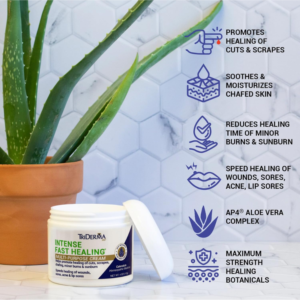 Concentrated multi-purpose healing cream for minor to severely damaged skin plus hard-to-heal skin sores contains TriDerma’s proprietary AP4 Aloe Vera Complex, vitamins, premium botanicals. Non-greasy, cortisone free, this is a must-have for your medicine cabinet. Pet friendly for cracked paws too