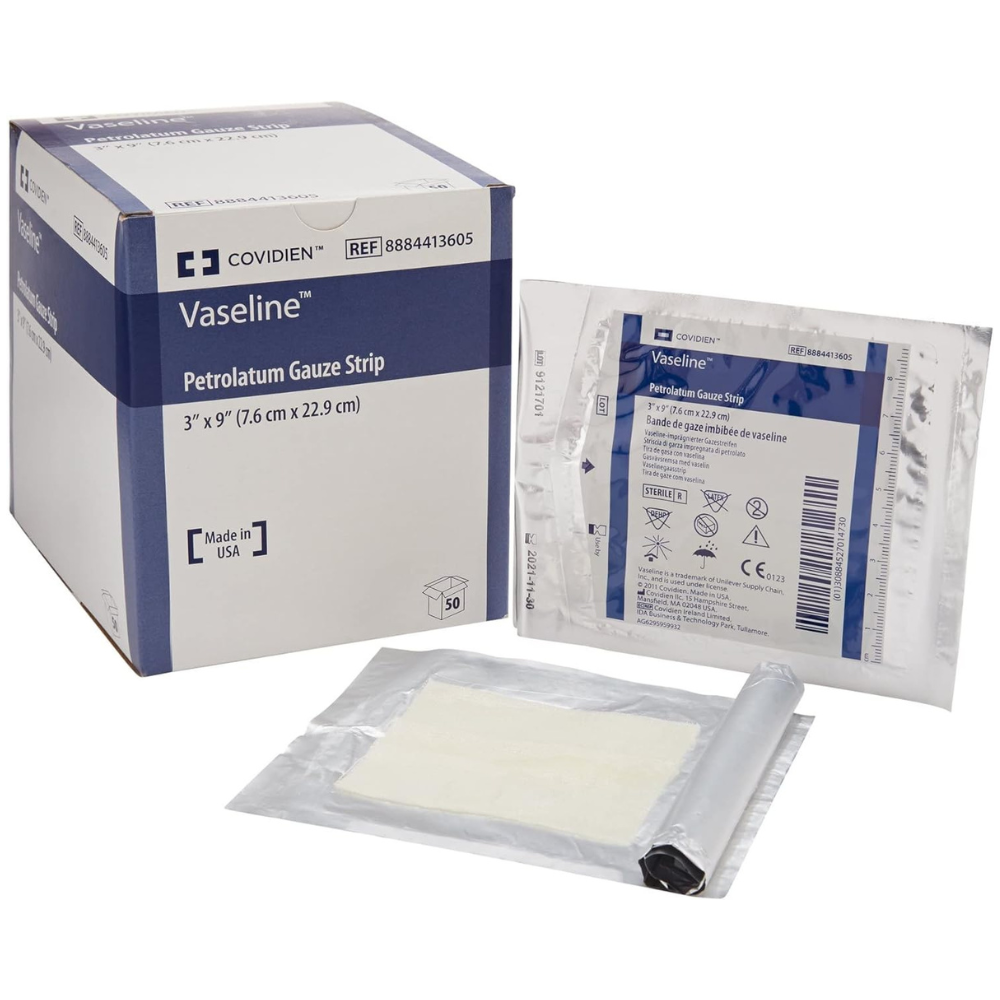 Vaseline Petrolatum Gauze Strip Dressing – 3″ x 9″, Box of 50 – Covidien