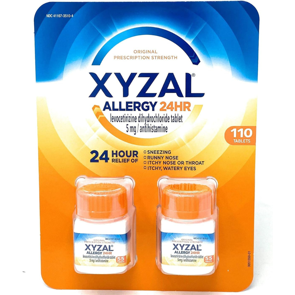 Xyzal now offers exceptional value over the counter with the same original prescription strength. Xyzal is proven to be as effective at hour 24 as it is at hour one, so you can count on long-lasting relief from symptoms such as sneezing, runny nose, itchy/watery eyes, and itchy nose or throat. Xyzal contains the active ingredient levocetirizine dihydrochloride and is an antihistamine pill.